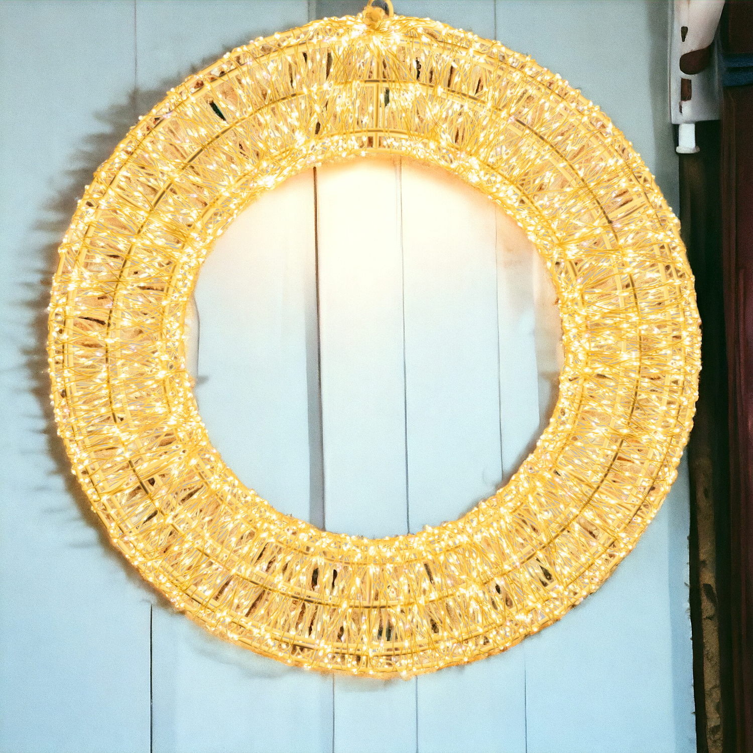 Corona 3D ø55cm HDM 3000 MicroLED BIANCO CALDO e BIANCO ø1,5mm, serie HDM ad alta densità di MicroLED con cavo Argento Silver Metal Pro, Telaio metallo verniciato Bianco, gioco di luce automatico FlashLED Diamond (led luce fissa + led con lampeggio veloce), Trasformatore di Sicurezza GS Pro IP67, IP44 uso Esterno e Interno, Cavo Alimentazione Trasparente 6m, Dimensioni 6m+ø55cm, Scatola Marrone con Etichetta Color (XKC Art. HDM S WH55 3000-H).