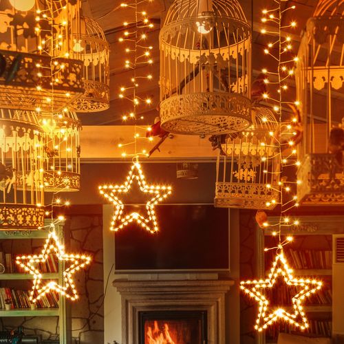 Ice Cluster Light 200xH90cm 3 Stringhe con Stella 392 MicroLED BIANCO CALDO ø1,5mm, Cavo Metallo Argento Metal Silver, con Stelle ø20cm doppio telaio in metallo Argento, gioco di luce automatico FlashLED Diamond (343 luce fissa + 49 lampeggio veloce), Trasformatore SELV di Sicurezza con Timer 8 ore disinseribile, IP44 uso Esterno e Interno, Cavo di Alim. Trasparente 6m, dotata di robusti Ganci per appenderla, Dimensioni 6m+200xH90cm, Scatola lusso color (XKC Art. ILPF-ST S 392-H).