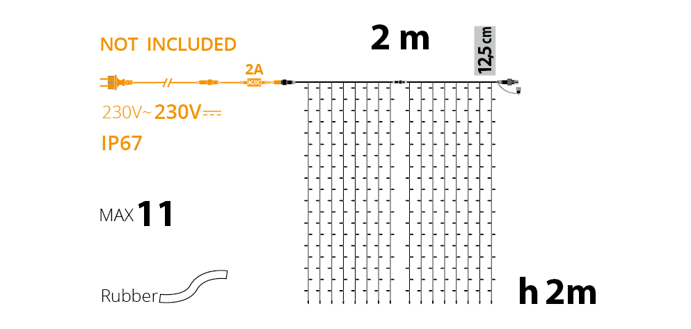 Tenda 2xH2m LCR-H 320 MaxiLED BIANCO CALDO ø7mm, Serie LED PL (PML) Professional 2pins, Cavo alimentazione non incluso, Prolungabile (Max 11 pz / 3520 led / 22m), gioco di luce automatico FlashLED Diamond (32 Flash), 230V, uso Esterno, Cavo gomma Bianco, Stringhe NON sostituibili, Dimensioni 2xH2m (2x1m), Scatola lusso EcoPack (XPLE Art. LEDF LCR 320-H B 2X2M SCA IP67).